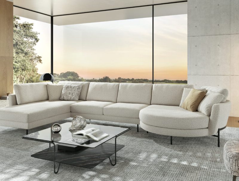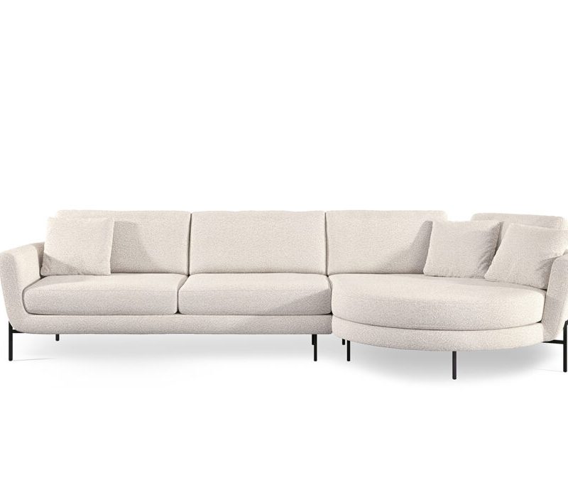The Kaze L-shaped sofa embodies sophisticated design and unparalleled comfort, distinguished by its meticulous attention to detail. Its asymmetrical silhouette is softened by rounded elements and curved shapes, creating a captivating aesthetic reminiscent of the gentle wind it is named after. A slim metal base adds a delicate touch, enhancing its overall lightness.